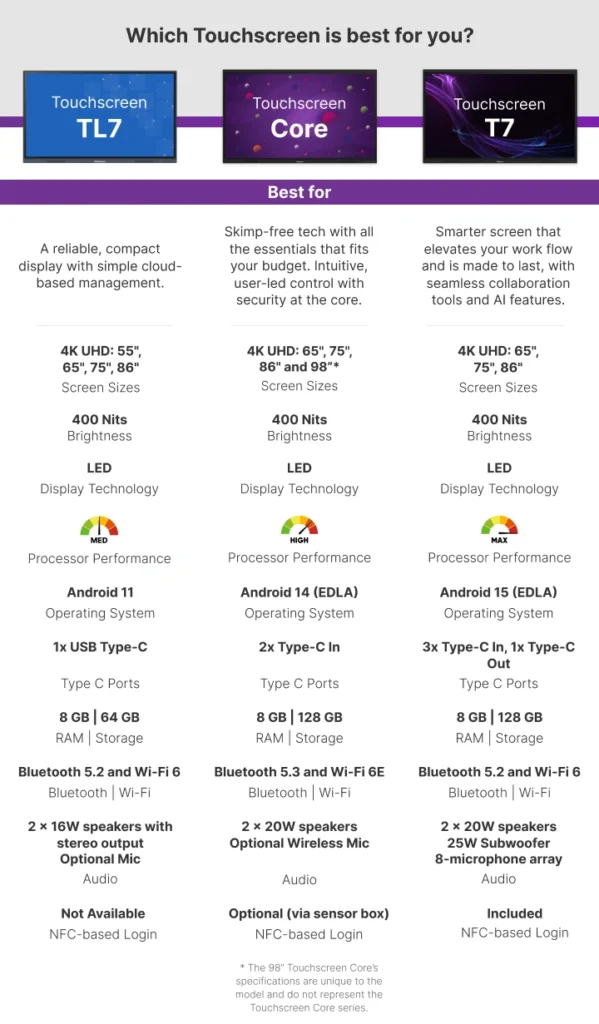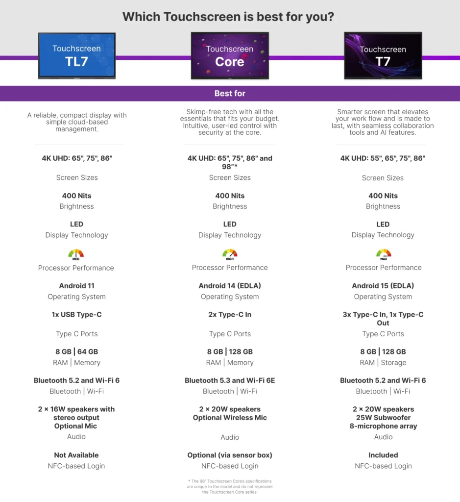Available in 65″, 75″, 86″, and 98″