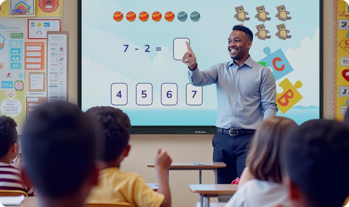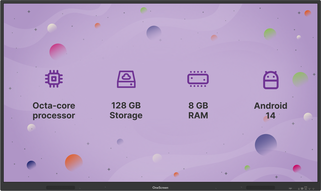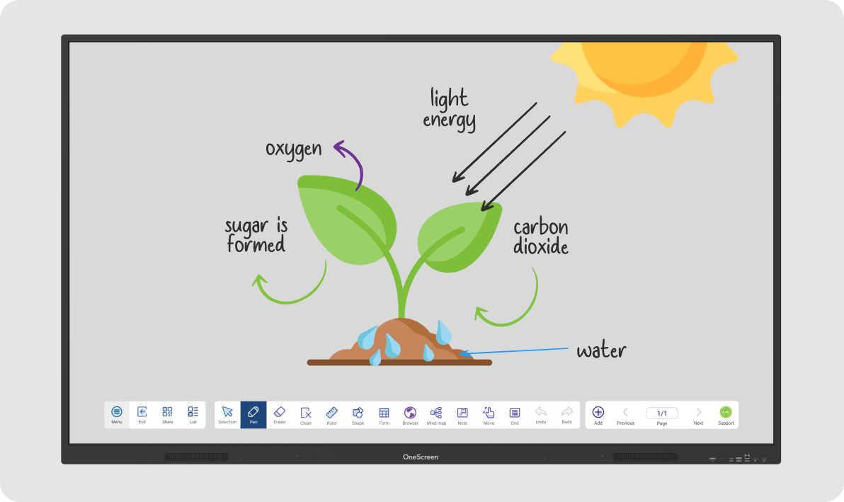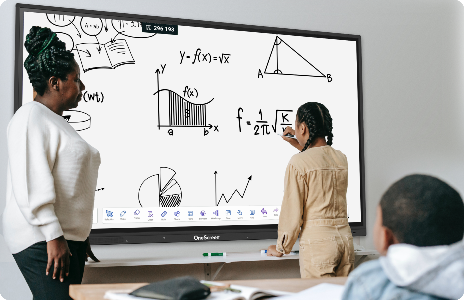 OneScreen Write is a powerful whiteboard with cloud drive integration, built-in browser, multiple pens, text recognition and an AI lesson library.
