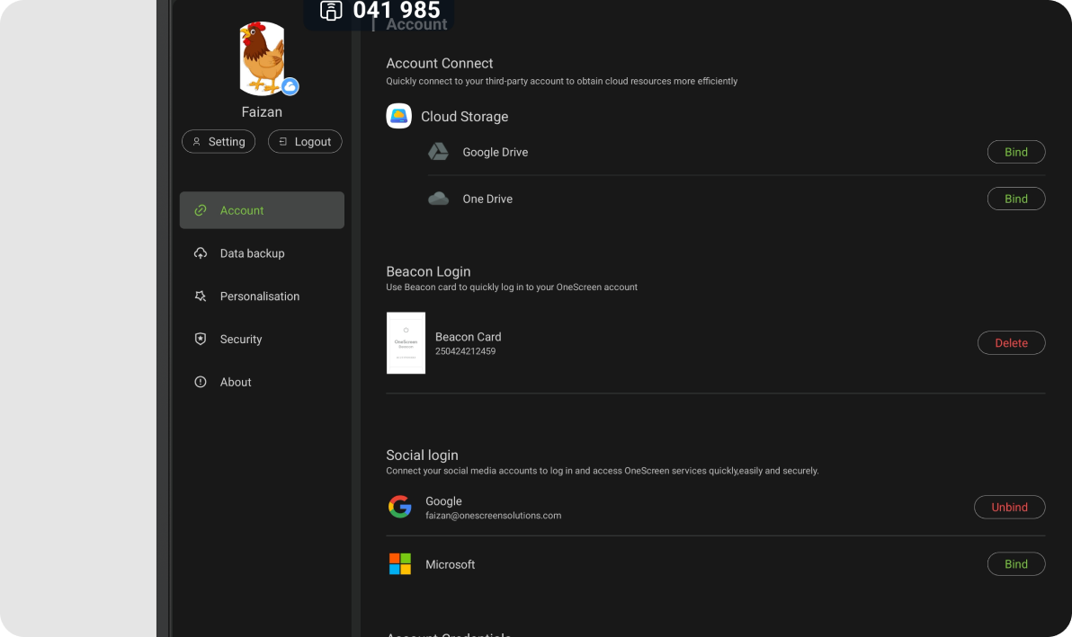 OneScreen Account provides secure single sign-on for Google, Microsoft, and cloud drives